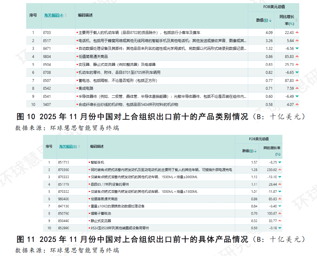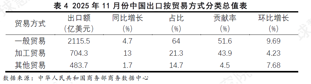 “核反映堆、汽锅、机械器具及零件”行业的出口形成相对复杂。保守支柱“从动数据处置设备”品类出口额同比下滑,而“集成电”等环节电子元器件则连结增加。这反映出行业出口沉心呈现出从终端设备向焦点根本部件延长的趋向。“车辆及其零件、附件”行业是本月增加的次要动力之一。整车出口是焦点驱动力,此中可插电夹杂动力车辆取保守燃油车配合形成增加从力。取之对应的是,“灵活车零件”品类出口同比下滑,表白当前增加次要依托整车成品输出,零部件商业尚未同步扩张。(如图9-11)中国对上合组织的出口展示出以机电产物和车辆为焦点的明显特征,出口劣势表现正在终端产物的多样化取升级。终端消费品取本钱品的出口,满脚了大体量经济体的多条理市场需求。财产趋向表示为新旧动能并存取部门范畴承压,一方面,新能源汽车部件及电力设备等品类增加敏捷,成为新的增加点;另一方面,从动数据处置设备及部门电子半导体器件、灵活车零件等品类的出口额同比呈现回调。潜正在风险正在于增加动力的布局性依赖。当前出口增加高度依赖于少数几个机电取车辆品类,出格是车辆整车的表示。若其次要市场的需求或商业发生变化,可能对全体出口发生较大影响。连结劣势终端产物的合作力,并关心两头品取零部件商业的不变性,是巩固该市场出口根本的环节。按照商务部商务数据核心统计(见表4),2025年11月份,中国出口商业体例的布局连结不变,但增加动力呈现较着变化。从增加贡献看,动力来历进一步向保守商业体例集中。一般商业以4。7%的同比增速,凭仗其规模劣势贡献了过半增加额,继续阐扬不变器感化。加工商业则表示出较强的增加弹性,其13%的同比增速取43。9%的贡献率,反映出其正在财产链需求回暖时率先苏醒。其他商业体例增加平缓。本月出口增加次要依托一般商业取加工商业配合拉动,两者合计贡献超九成的增加额。这一布局表白,正在外部需求阶段性改善的布景下,一般商业的财产链纵深取加工商业的全球供应链活络度,构成了互补的拉动款式,配合支持了全体出口的回升。