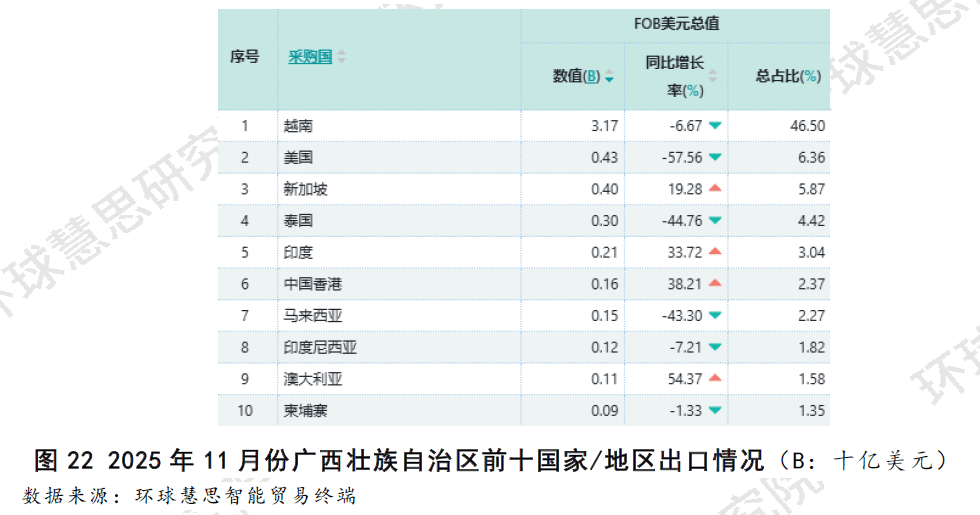 如图22所示,广西对越南的出口占领绝对从导但增加乏力,越南以46。50%的总占比成为广西首要出口市场,但其出口额同比下降6。67%。这表白广西外贸的根基盘高度集中且面对压力,值得留意的是除越南外,另一次要保守市场美国的出口额同比大幅下降57。56%,泰国、马来西亚等亚洲保守伙伴也跨越40%的降幅。正在对保守市场的出口全体处于深度调整期,远未实现苏醒的当口。新兴取次要市场成为焦点增加点,多个市场份额较小但增速迅猛的市场形成了增加亮点。此中,对、中国、印度和新加坡的出口均实现强劲双位数增加。这些市场的积极表示,是抵消次要市场下滑、鞭策总额增加的环节力量。