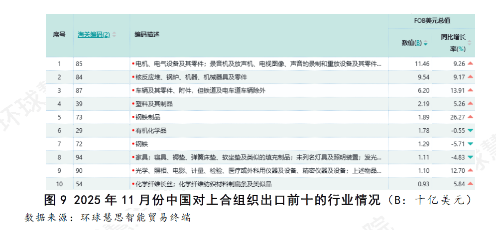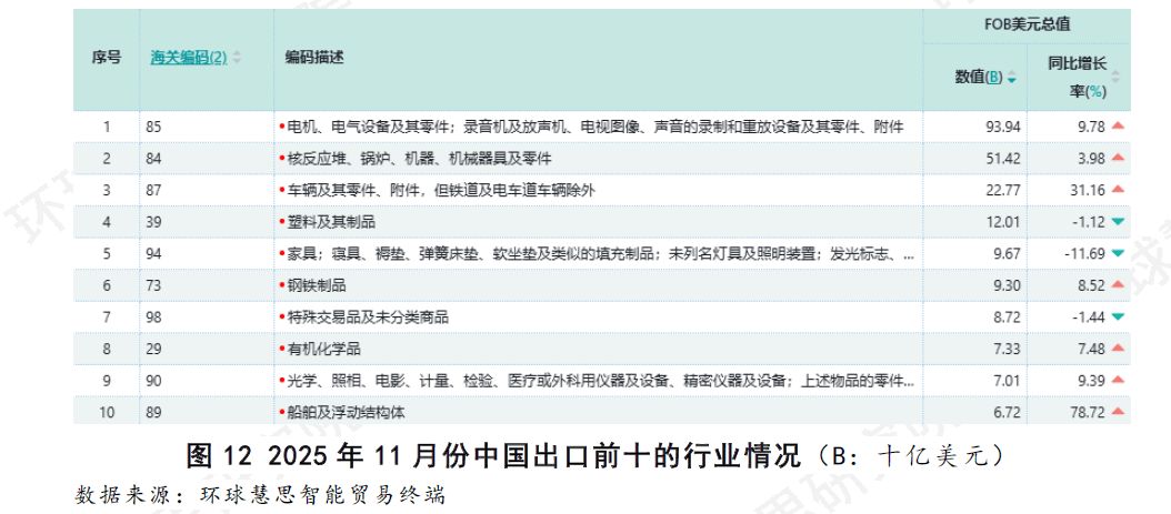 按照全球慧思智能商业终端数据统计(如图12),2025年11月份,中国出口行业呈现次要依赖于少数几个手艺稠密型的制制业范畴的特征。“电机、电气设备及其零件”行业以939。4亿美元的出口额占领显著领先地位,其规模接近排名第二的“核反映堆、汽锅、机械器具及零件”行业的两倍。上述两个行业取排名第三的“车辆及其零件、附件”行业配合形成了出口的次要部门。