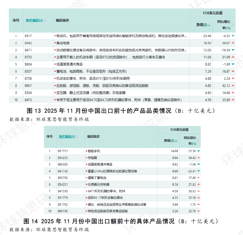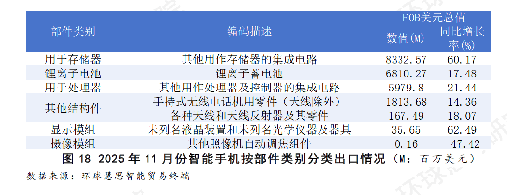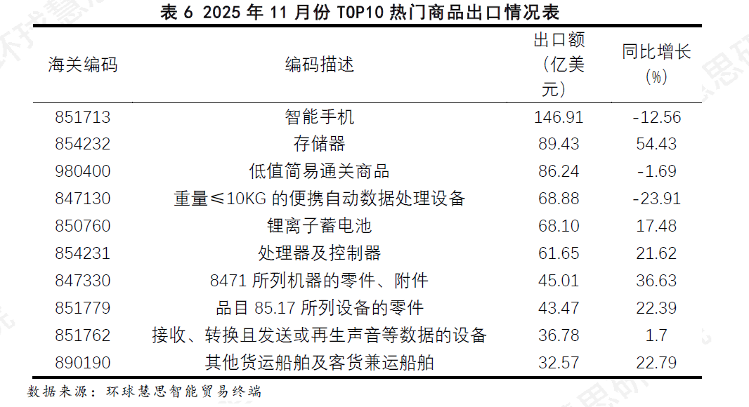 2025年11月份,按照中国出口额排名前十的具体商品能够看出,位居首位的智妙手机是独一的终端消费品代表;而紧随其后的第2至第10名,则由存储器、处置器、锂离子蓄电池、各类细密零件以及货运船舶等7项环节两头品取本钱品占领。这不只表白中国出口的支柱已超越单一最终产物,更凸显出其正在全球半导体、新能源和高端制制供应链中做为焦点部件供给者的环节脚色。正在这一由焦点部件从导的出口布局中,排名榜首的智妙手机做为独一的终端消费品代表,尤为值得深切阐发。(如表6)