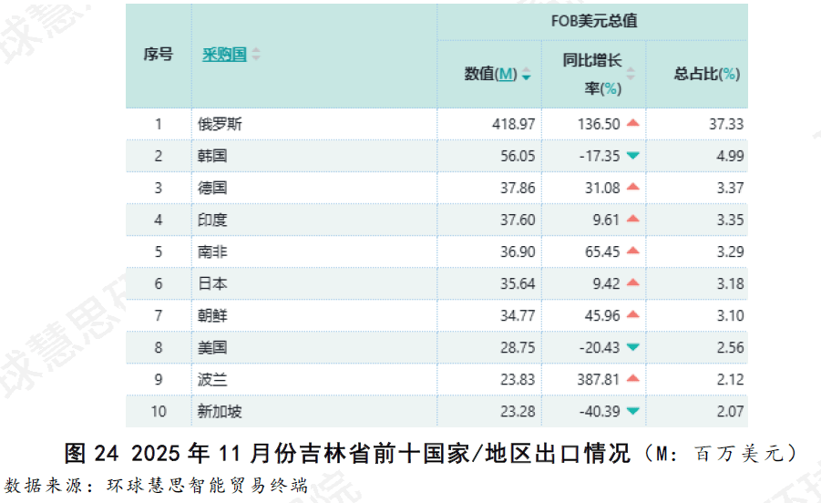 如图24所示,俄罗斯市场位于省出口的从导地位,省对俄罗斯的出口额是韩国的7倍以上,且同比大幅增加136。50%,是拉动其全体出口增加的焦点。能够看出,省的增加并非源自保守市场的平衡回暖,而是由对一个环节市场的深度开辟所驱动。做为保守主要市场的韩国和美国,出口额同比别离下降17。35%和20。43%,而、日本等保守市场虽连结正增加,但增速远低于俄罗斯,贡献无限。新兴市场成为焦点增加极,省对波兰的出口以387。81%的增速,取南非、朝鲜配合形成了出口增加的新兴板块。省本月的增加动能高度集中于以俄罗斯为焦点,以波兰、南非等为弥补的新兴市场收集。取此同时,对韩国、美国等保守市场的出口未能苏醒,以至呈现收缩。这种布局,正在彰显对特定市场开辟成功的同时,也出市场集中渡过高的显著风险。