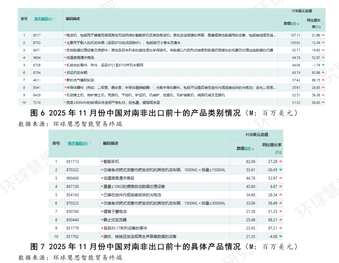 虽然南非当月出口总额环比显著下滑,但对其出口布局的深切阐发显示,这一下降并未全面波及所有次要商品。正在排名前十的行业、品类及具体商品中,大都项仍连结着同比增加。中国对南非出口布局呈现机电取车辆制制业从导的明显特征。排名前三的行业“电机、电气设备及其零件”、“核反映堆、汽锅、机械器具”及“车辆及其零件”合计出口额显著领先,形成了对南非出口的三大支柱。其余行业规模相对较小且分布分离,显示出中国对南非的工业制成品出口高度集中于少数几个手艺稠密型范畴,头部效应十分凸起。(如图5所示)