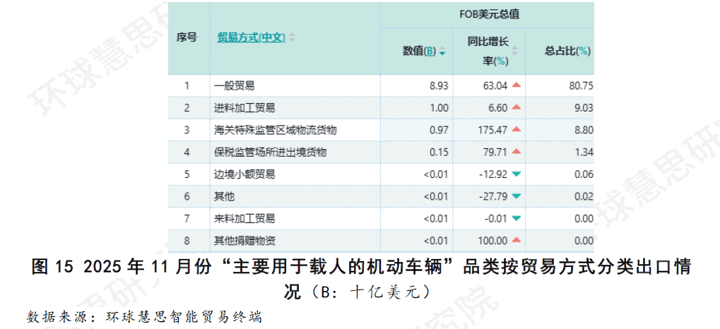 “核反映堆、汽锅、机械器具及零件”行业中,零件出口面对显著压力,从力品类“从动数据处置设备及其部件”同比下降16。56%,其代表商品“便携式从动数据处置设备”增加乏力,此次要源于全球需求疲软及高基数效应。然而,其环节配套品类“公用零件取附件”实现了35。80%的高速增加,商品“8471所列机械的零件、附件”表示凸起。由此看出,行业的增加引擎正从尺度化零件产物的规模出口,转向面向全球出产取维修收集的高附加值、高定制化环节零部件的供给。(如图12-14)“车辆及其零件、附件”行业是前三大行业中增加最为迅猛的范畴,其增加已改变为由自从品牌整车出口从导。次要因为品类“次要用于载人的灵活车辆”同比大幅增加61。09%;且该增加以“一般商业”体例为从体,这间接表现了自从品牌的输出。比拟之下,其配套“零部件”增速仅为2。24%,表白增加动力源于整车间接出口而非零部件间接配套。这一布局性改变,申明中国汽车出口正在国际市场上实现了从“加工拆卸”到“品牌输出”的环节逾越,这一强劲表示次要得益于中国新能源汽车正在海外市场取得的冲破性进展。(如图12-15)