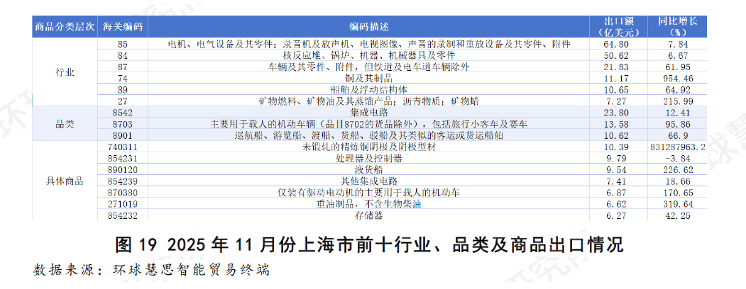 基于2025年11月份上海市的出口数据(如图19),“电机、电气设备及其零件”和“核反映堆、汽锅、机械器具及零件”做为两大保守支柱,出口额位居前列但其同比增速相对平缓。实正的增加引擎则呈现正在其他范畴,“车辆及其零件、附件”和“船舶及浮动布局体”增速均跨越60%,“铜及其成品”和“矿物燃料”行业更是实现了跨越200%的迸发式增加,成为显著的增速亮点。从品类和具体商品层面,能够看出新能源汽车是首要驱动力,“次要用于载人的灵活车辆”品类及其下的“仅拆有驱动电动机的灵活车”同比增加均增加,是先辈制制业出口中最凸起的增加点。高端船舶出口表示亮眼,“巡航船、旅逛船、渡船、货船、驳船及其雷同的客运或货运船舶”品类增加66。90%,其焦点商品“液货船”同比飙升226。62%,显示出上海正在高端配备制制范畴的合作力。集成电出口稳健但分化,做为最大单一品类的“集成电”实现了12。41%的不变增加,但内部呈现分化,“处置器及节制器”同比微降,而“存储器”和“其他集成电”则连结正增加,表现了该财产链的复杂性。部门大商品取原材料异动显著,“未锻轧的精辟铜”取“沉油成品”的出口额别离实现了非常惊人的同比增加,这取特定商业勾当、国际市场价钱或短期供应链调整相关,是拉动本月增速的主要“变量”,但其可持续性有待察看。本月上海出口的高增加,并非源于保守支柱财产,而是由“新能源汽车”和“高端船舶”这两大先辈制制板块的强劲迸发,叠加“铜”和“成品油”等少数大商品的非常增加配合驱动。显示出上海出口布局正处于动态升级过程中,新旧动能转换的特征较着。