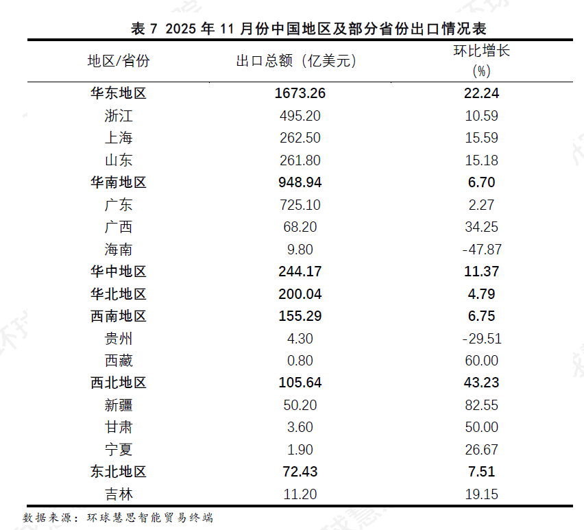 据全球慧思智能商业终端数据统计(见表7),本月中国区域出口,西北地域和华东地域是次要增加极。西北地域以43。23%的环比增速遥遥领先,其增加多由新疆的单极迸发所驱动,甘肃和也贡献了高增速。华东地域做为出口规模的绝对焦点支柱,正在复杂基数上仍实现了22。24%的较高增速,此中山东、上海、浙江等次要省份同步向好,构成了“规模取增速兼具”的增加模式,是本月出口大盘最的支持。增加压力来历于少数省份的深度下滑,由此抵消了部门增加幅度,此中海南和贵州的环比跌幅最为显著,但因为其出口额较小,对全国总量的间接影响无限。更值得关心的是,做为三大出口焦点省份之一的广东,其环比增速仅为2。27%,显著低于全国大都次要省份。各地域内部表示差别较大,最典型的是华南地域,广西以34。25%高速增加,海南却深度下滑,而焦点广东增加接近停畅,显示出严沉的内部门化。西南地域也呈现雷同环境,能够看出保守焦点增加引擎动能削弱,而新的增加点尚不脚以带动全区。比拟之下,华东、华中地域内部各省份的增加标的目的根基分歧,程序更为协同。保守从力省份的增加贡献正正在发生切换,出口额前三的浙江、江苏、广东中,浙江取江苏连结了可不雅增速,但广东已显疲态。取此同时,新的增加极正在规模较小的省份,正在环比增速排名前列的新疆、、甘肃、广西、中,出口额基数均相对较小,其高增加对全国总量的提拔感化,尚不克不及取大省一概而论。