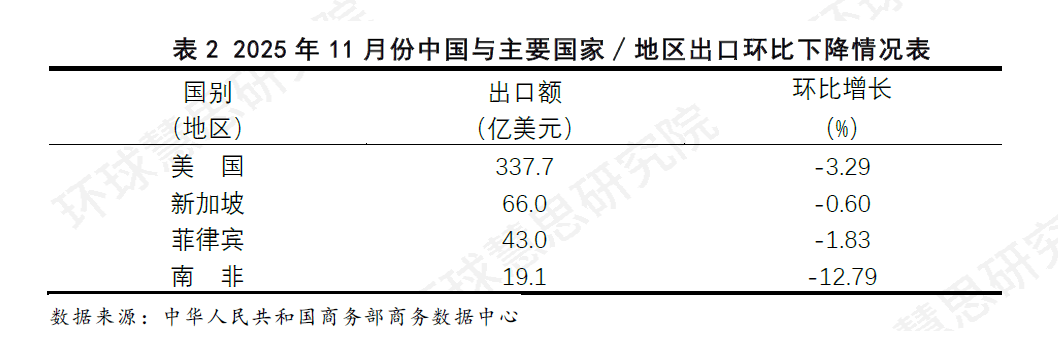 “矿物燃料”行业的增加,次要由“石油气及其他烃类气”和“煤”品类驱动,对应的商品别离是“液化天然气”和“烟煤”。这些商品出口额的大幅增加,取正在能源范畴的现实进口需求增加间接相关。“船舶及浮动布局体”行业,其次要由浮动式钻探或出产平台这一单一商品支持。这并非通俗消费品,而是典型的沉型本钱品,其出口印证了正在海上油气等资本开采范畴正正在进行严沉的本钱投资,并将中国视为焦点设备供应商。(如图2-4所示)“电机、电气设备及其零件”行业表现了中国制制的多元化合作力。其次要增加来自“蓄电池”和“德律风机”品类,出格是此中的“锂离子蓄电池”和“智妙手机”,这表白中国出口正成功进入的消费电子取新能源储能市场。(如图2-4所示)从行业、品类到商品的三层阐发,察看出中国对澳出口的双沉劣势取潜正在风险。劣势一:中国的出口布局呈现出不只限于原料供应,而是扩展至涵盖原料、开采设备、能源产物及储能设备的组合特征。这反映出“中国制制”正在满脚资本需求的同时,也涉及对资本开辟取能源转型相关的设备取组件供应。劣势二:正在消费电子取特定两头品范畴展示出不变的市场渗入。智妙手机、便携式电脑、未锻制金等商品连结持续出口取增加,表白相关中国产物正在消费市场取财产供应链中已构成必然的需求根本,这有帮于提拔双边商业布局的多样性。潜正在风险:出口布局呈现出对资本相关需求的相对集中。当前增加较多依赖于同矿业取能源范畴相关的部门大商品及本钱品。若相关行业的投资勾当或商业政策发生调整,可能对后续中国对澳出口的不变性带来影响。这一布局性特点提醒需持续关心次要商品需求端的波动环境。从环比下降的具体国度取地域来看(见表2),仅美国、新加坡、菲律宾和南非四个市场的出口环比下降,这表白当月出口收缩面很是无限,显示出全体出口态势仍具韧性且风险较为集中。做为最大单一出口目标地,美国出口额虽位居首位但环比小幅下滑,这可能反映了其做为保守焦点市场的需求呈现了短期波动。新加坡取菲律宾的降幅均未跨越2%,申明这两个市场的出口回调幅度暖和,影响相对无限。比拟之下,对南非的出口环比下降幅度最为较着,申明部门区域市场需求仍面对较大的阶段性压力。