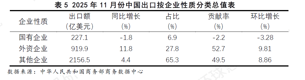 2025年11月份,中国出口按企业性质分类总值数据显示(见表5),从布局上看,以平易近营企业为从的其他企业,其65。3%的份额形成了出口的根基盘,表现了内资企业正在对外商业中的规模劣势。从增加动能看,外资企业展示出更为强劲的拉动感化,其以27。8%的出口份额贡献了52。7%的增加额,显示出其正在当前出口回升周期中饰演了环节增量脚色;其他企业虽贡献了残剩49。5%的增加额,但4。4%的同比增速取其复杂的规模基数比拟,显示出其增加径更趋平稳。深层来看,本月出口增加来历于外资取平易近营企业,这既表现了中国深度融入全球分工系统取国内财产合作力的连系,也提醒增加布局存正在必然依赖性。将来出口的可持续性,取决于平易近营企业可否正在规模劣势根本长进一步提拔增加动能,以及外资企业的景气苏醒可否延续。