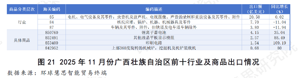 基于2025年11月份广西壮族自治区的出口数据(如图21),其出口高度集中于机电取车辆制制范畴,“电机、电气设备及其零件”行业取“核反映堆、汽锅、机械、机械器具及零件”和“车辆及其零件、附件”配合形成了出口的绝对支柱,奠基了手艺稠密型出口的基调。以“锂离子蓄电池”为首的环节商品为增加从引擎。该商品出口额达4。15亿美元,同比增加35。04%,能够看出广西正在新能源全球财产链占领一席之地 。同时,“印刷电”取“其他液晶平板显示模组”别离实现了109。19%和88。49%的增速,表白广西正加快融入电子财产的全球两头品供应链中。配备制制潜力,“上部360度扭转的机械铲、挖掘机”80。00%的高增加,展现出广西正在工程机械等特定配备制制范畴的出口合作力正正在快速。广西的增加并非保守劳动稠密型财产的线性扩张,而是表现正在新能源储能、电子焦点部件取配备等多个高端制制环节的冲破。这表白,其外贸动能已从依赖最终消费品,转向为全球财产链供给环节两头品取公用设备,外贸增值能力正正在发生量变。